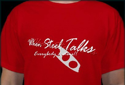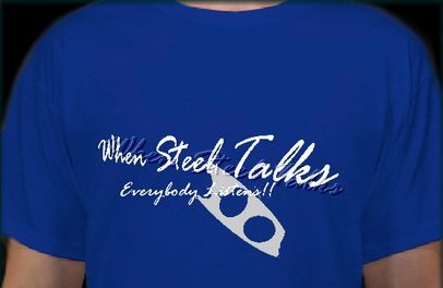 Select from a limited run in several colors including Black, , Fatigue Green (the latter two are sold-out), Cardinal Red, Charcoal Grey, Royal Blue, Dark Burnt Orange or Deep Red (now all sold-out, with the exception of Royal Blue XL) When Steel Talks T-Shirts. Long Sleeve T-Shirts - in BLACK (sold-out)- also available sizes in stock: Medium, Large, X-Large and 2XL. Cost - USD $22.00 upwards, plus shipping & handling.